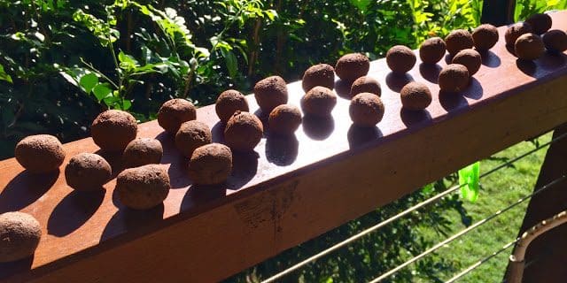You won’t believe how much fun I had making seedballs and experimenting with slingshot designs using bamboo and cuttings of weed trees. We’re getting ready to make a whole lot more with kids on Monday for our ‘Inaugural Seedball Slingshot Games’ – a holiday activity of the Nature Kids program I run. I made about 100 little sample ones today that dried quickly on the verandah rail.