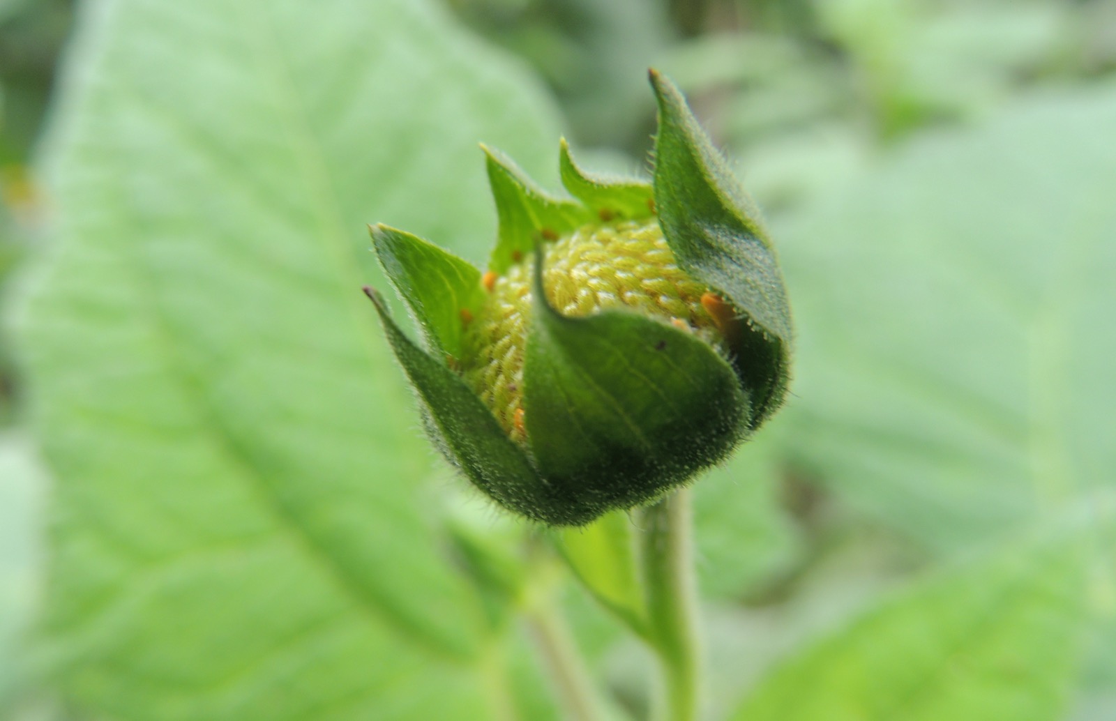 | Maia’s picture of the Yacon (peruvian ground apple) flower just opening. It is a relative of the sunflower. When it opens this means the yummy edible roots are ready to start harvesting soon. |