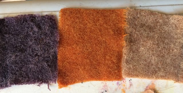 A natural-coloured old wool blanket dyed with vegetables. These colours are fast. Purple carrot = purple (of course). Onion skin = orange. Avocado seed = light brown. |