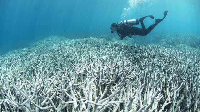 | Diver checking the bleached coral at Heron Island on the Great Barrier Reef – image from XL Catlin Seaview Survey. |