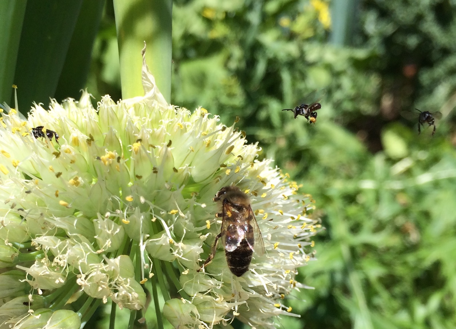 | Native and honey bees visiting my flowering perennial welsh onion today. |