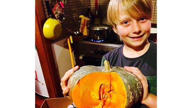 I didn’t plant this, water it or do anything but harvest. This lovely large one that Hugh is holding has been delicious as pumpkin soup for the past few nights.