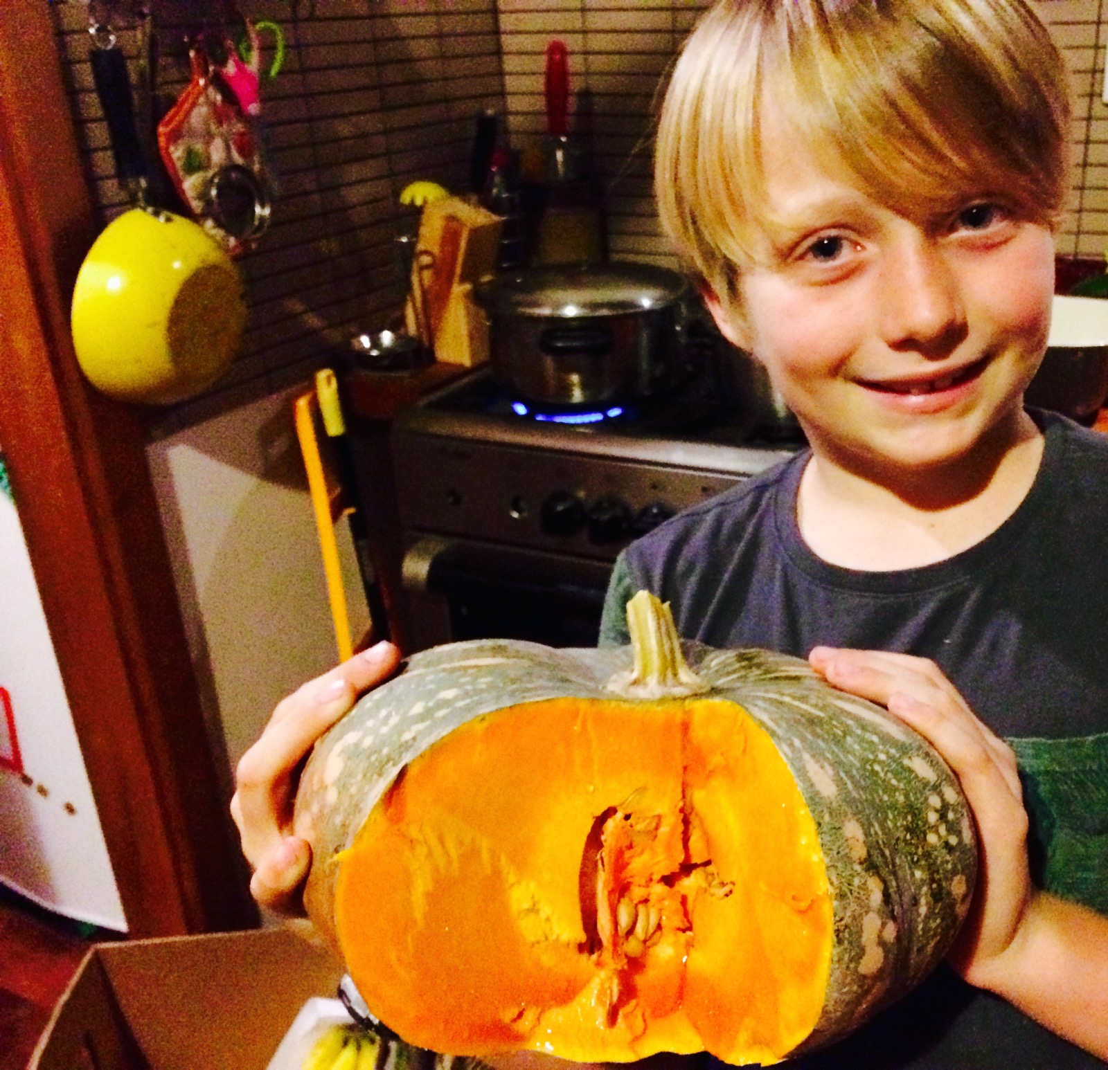 I didn’t plant this, water it or do anything but harvest. This lovely large one that Hugh is holding has been delicious as pumpkin soup for the past few nights.