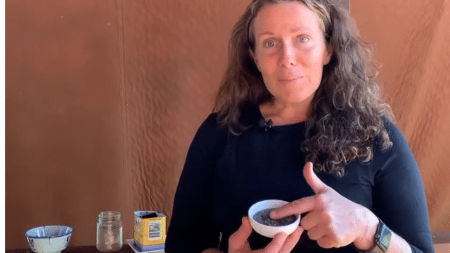 So one of the things that often gets wrapped in plastic, are things like salads, and sprouts, and all that kind of stuff. So it’s so simple to get some things happening in your garden. And even if you don’t have a garden, I wanted to show you something. That you can do today, that’s so simple. That you can easily get fabulous, super nutritious greens within the space of a week. So many of you, I’m sure, know about chia. Now chia is this tiny little seed, and you can buy it in most stores now. So you probably even have some in your cupboard, great things to sprinkle on cereals, or to grind up into baking goods. Or you can add them into smoothies, or mix them with coconut milk. To make chia pods, all that kind of stuff is really fantastic protein. Now did you also know that you could plant them so you can plant them. And then very quickly they turn into sprouts really quickly, and then you can get little microgreens. You can just snip them off, and eat those as a salad green. Or you can let them come up a little bit bigger and just be plucking off the leaves. I often sprinkle them around the garden too, and then wait until they get really big. And then have the little, get the seeds off them as well. So I just wanted to show you a very quick thing. So even if you don’t have a garden, or you have even a tiny balcony and you’ve got a windowsill you can grow them. So I went sort of searching around bins down at the community, looking for some of these tetra pack type of things. So you can chop them down, put some soil inside, and then just sprinkle the seeds across the top quite thickly. It’s really good. I don’t know if you can see that, and then get a little bit of extra soil. Sprinkle that over the top to cover it over, there we go! Can’t see the seeds anymore, and then a little bit of water, to water that all in. So if you just give them water, maybe twice a day, depends if it’s in a sunny spot.