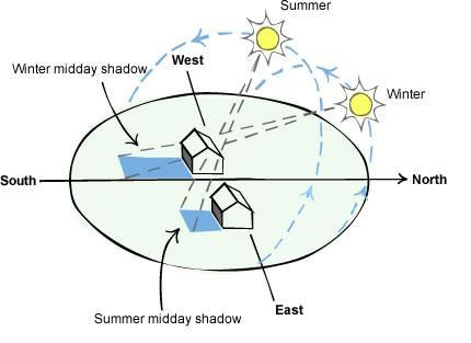 Considering the sun, the ideal orientation of a house is with the long side of the house running east-west. This reduces the heat absorbed on long summer days – particularly on western walls, and gives maximum surface for light and heat absorption on midwinter days when the sun is lower in the sky.