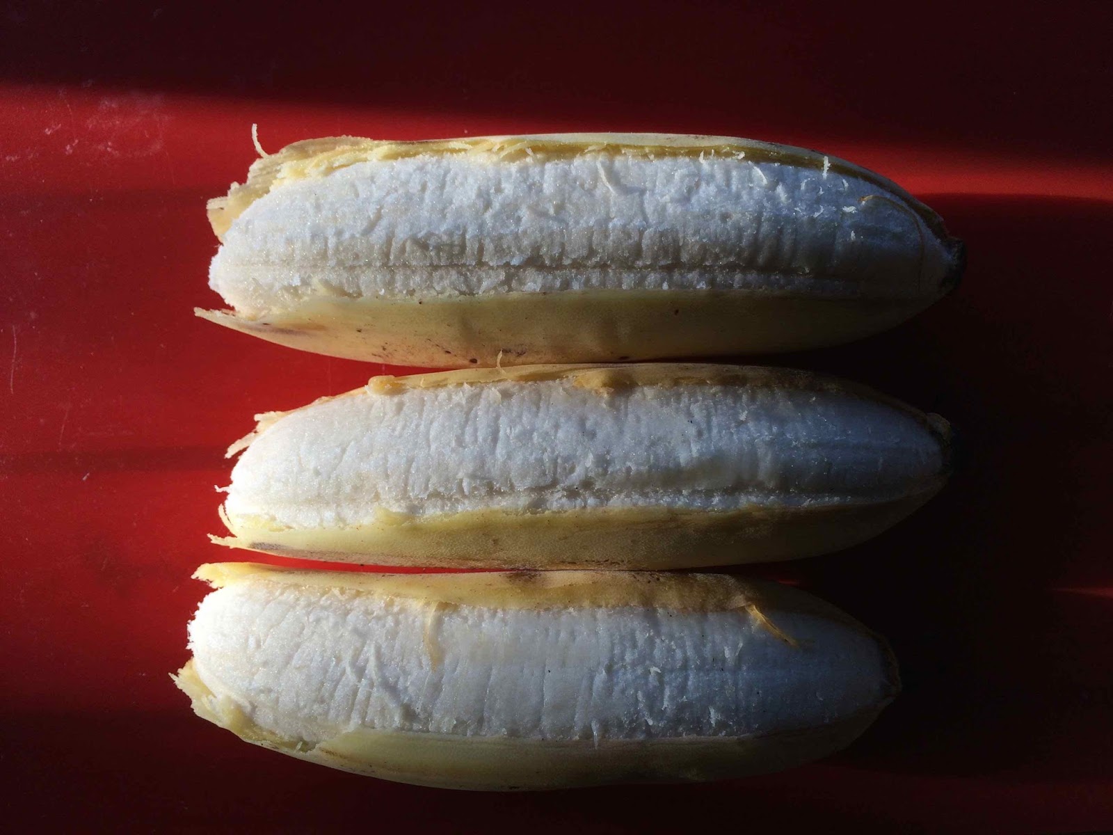 | Today 14 February, the bananas were so ripe they were dropping off the stem – literally unpeeling themselves. The flesh was not at all squishy – just perfectly firm, sweet and yummy. |