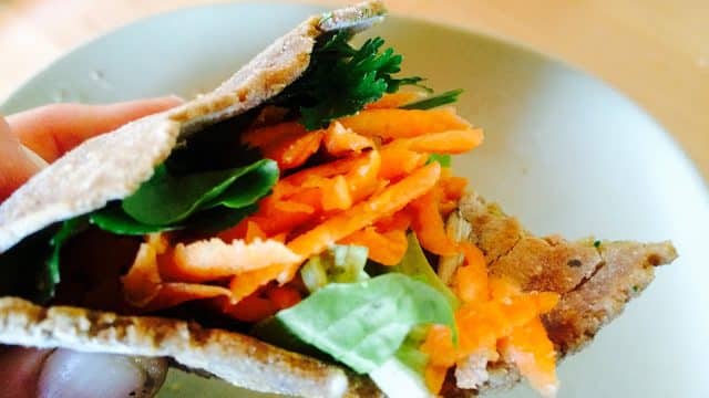 It took me less about 15 minutes to prepare this meal and it was SO good. The salad was plucked fresh from the garden and the teff wrap (flatbread recipe below) was made moments before I harvested the salad.