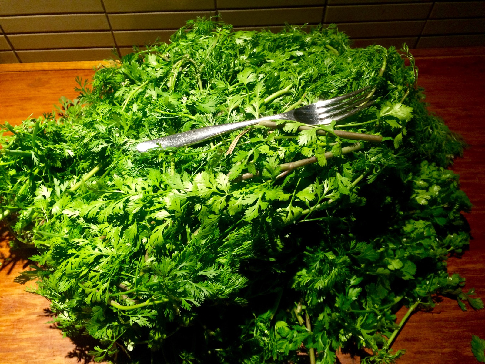 I chopped off bunches and bunches of leaf that included the younger leaves and the more feathery ones.  All of them taste great and are super to use in these preserves.