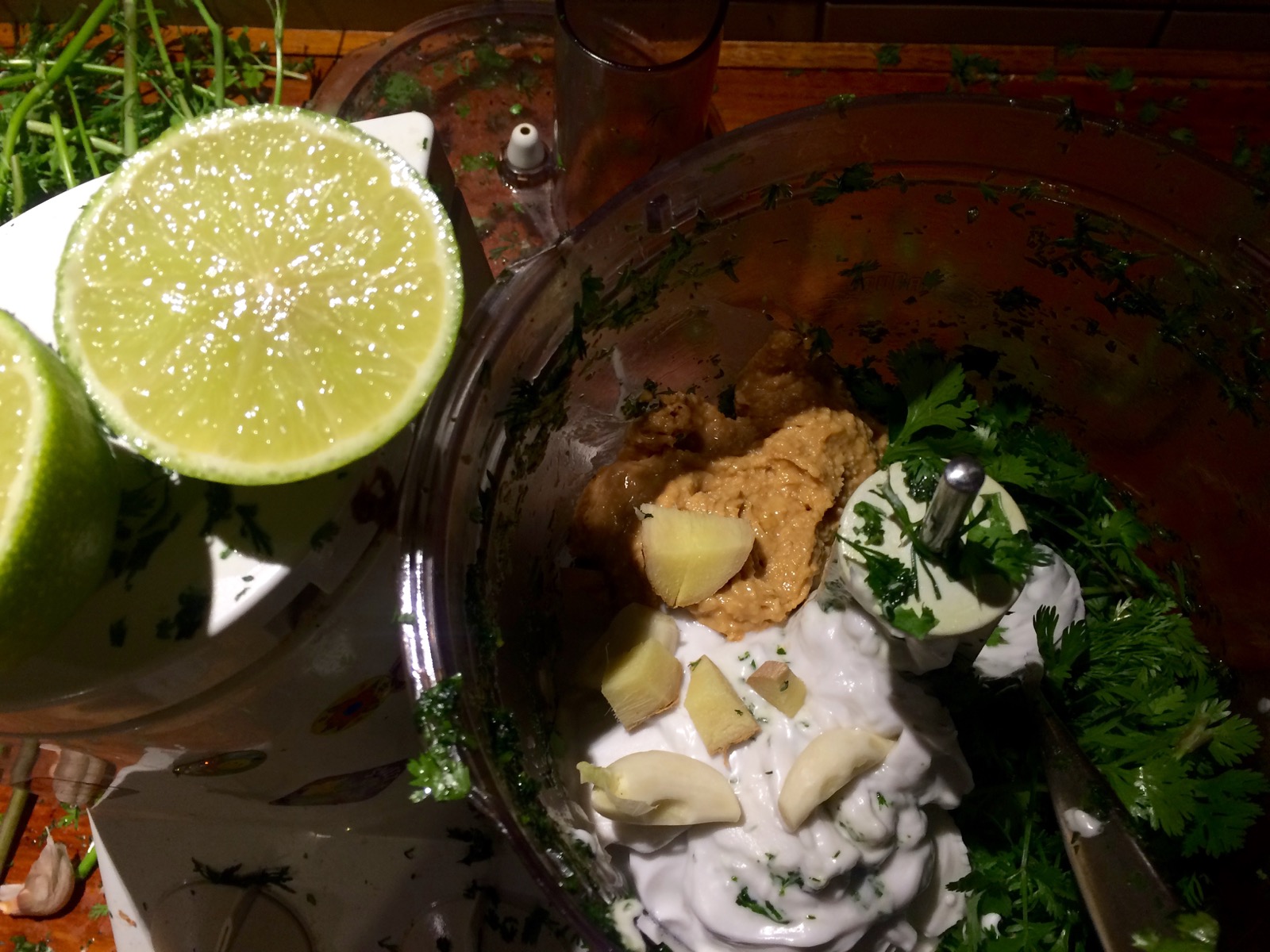 I had some about 2 cups of leaf still left, so I also whipped up a jar of cilantro satay – organic coconut cream, organic peanut paste, garlic clove, chunk of ginger, juice of a lime and a long red chilli (missing from the photo). I have been using this with tofu and to dress salad – yum!