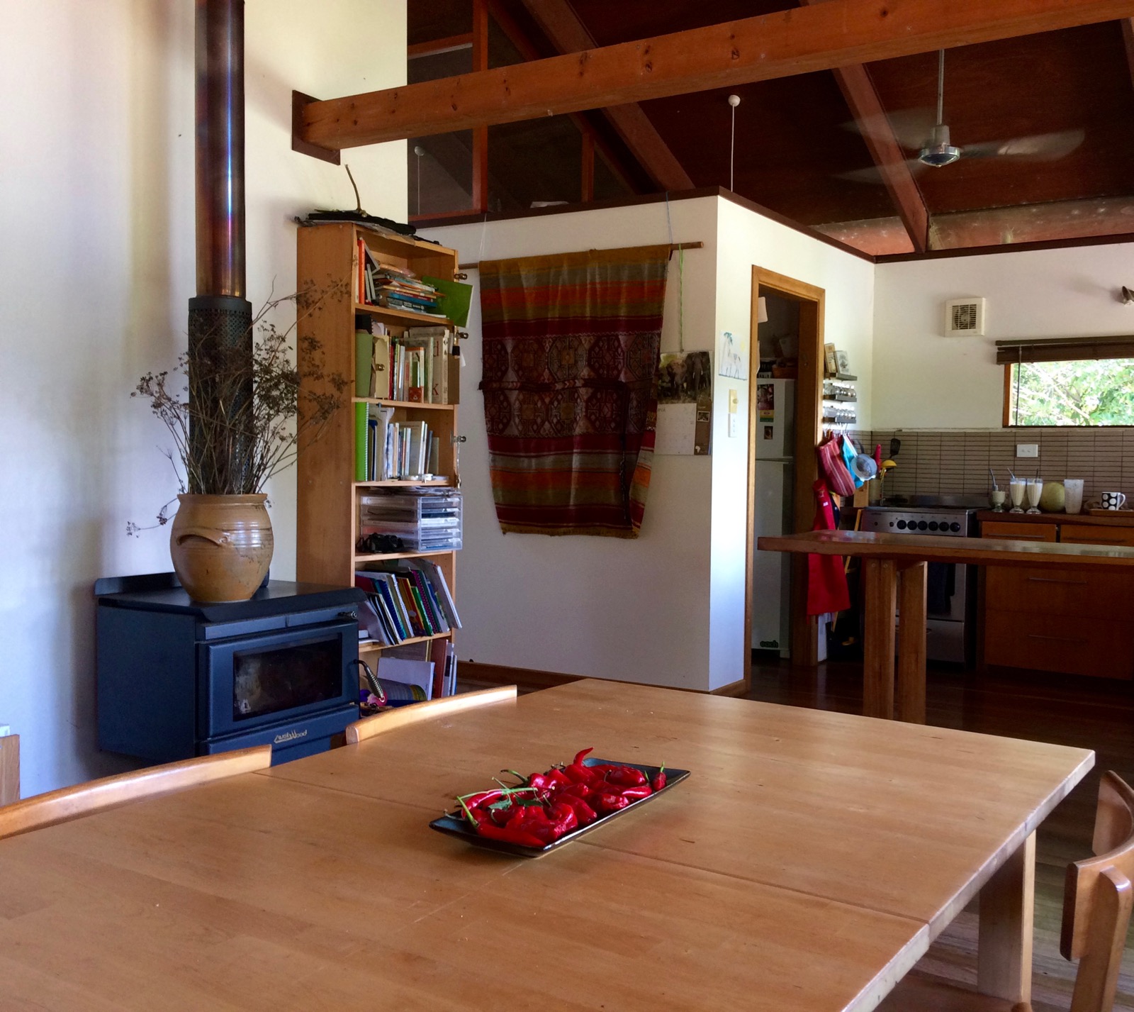 This is our living/dining room… a warm fireplace for winter using wood we collect onsite, a plate full of freshly harvested chillies, a vase of freshly picked fennel seeds, the vase is a wedding gift from my brother – it was made at the pottery where my gran used to go, the wall hanging we brought back from Turkey and reminds me of the amazing world adventures we have had with permaculture and all the amazing things people are doing around the world, the timber kitchen benches are hand crafted from a tree that fell just a few hundred metres from our home, the chairs are from the local tip shop, the walls are painted with non-toxic milk paint, the floors are from reclaimed timber, the top of the wall is made of glass to allow a gentle glow to reflect in from the external orange wall, children’s artwork decorates our walls, the banana smoothies are made from our homegrown bananas and sweetened a little with our friend’s honey, the bookshelf is full of interesting books for all ages, we placed the window above our kitchen bench just at the right height so we could look out to the trees and the Conondale Mountain range beyond.