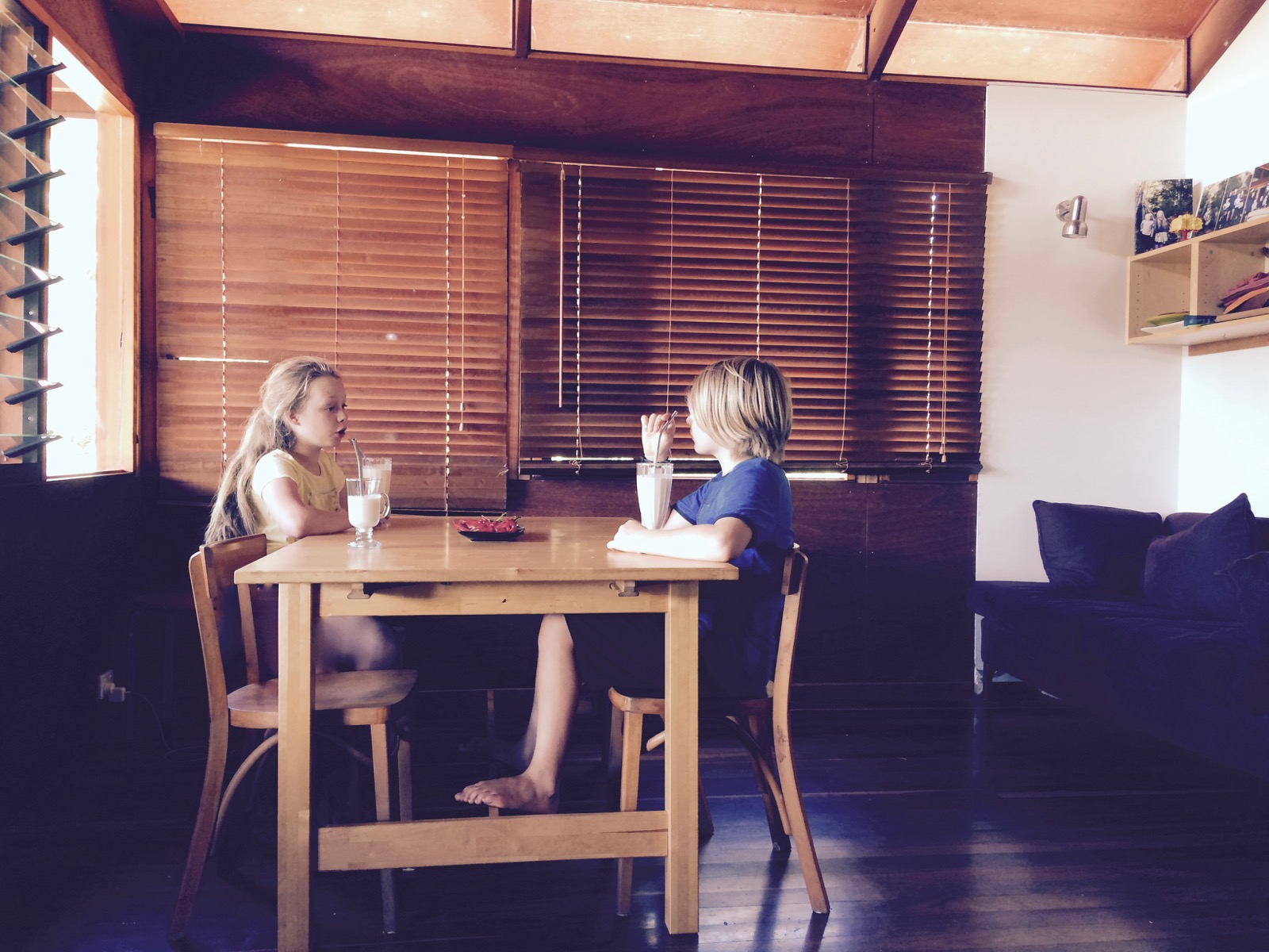 Maia and Hugh chat about their homeschooling projects over a morning tea of banana smoothie they made using our own fruit. Their straws are reusable stainless steel. We usually go barefoot indoors and out – it’s certainly warm enough. The couch with lots of cushions usually has someone curled up reading or thinking. The louvre windows and doors are typically open allowing fresh air to flood into the house. There is a huge indoor-outdoor connection at our place.