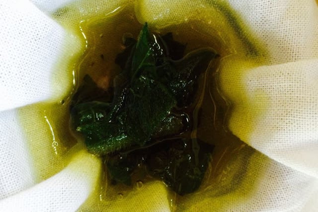 After one month, the comfrey leaves are strained from the oil.