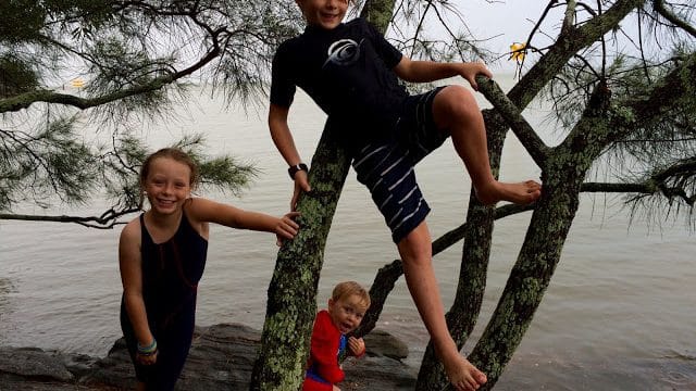 | We spent today playing in the rain at Lake Cootharaba – rock hopping, tree climbing, splashing about, paddling, snorkling, cloud watching and exploring. |