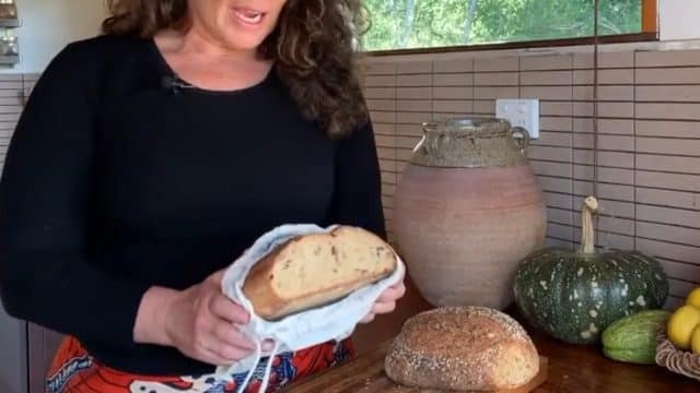 Queensland. And one of the wonderful things about this place is that there’s a village green. And every Saturday morning the Baker has beautiful bread. So they would find sourdough organic breads, and they have things like five seeds and olive Infanta breads. And so all I need to do is take down a little bag, and I can get all the breads I want and bring them back. And then I just wash it out and use it again, or actually just store the breads in these all week, it’s fantastic!