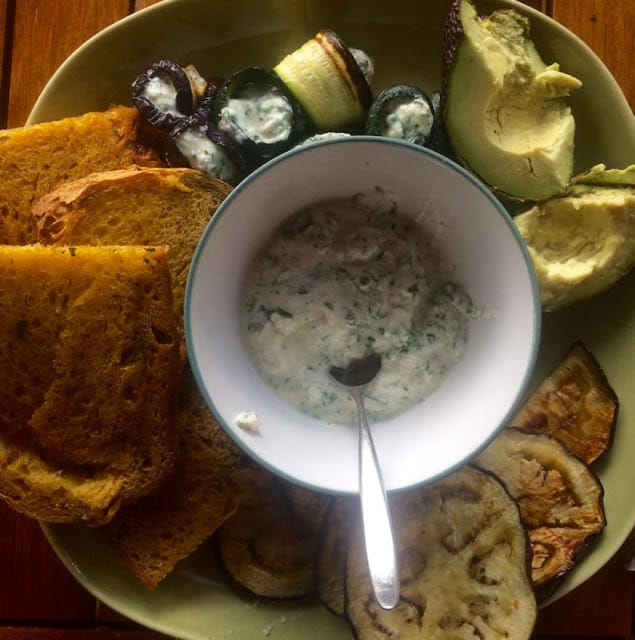 Maia's lunchtime creation: Courgette Rolls, Eggplant, Avocado, Ricotta Dip and Sourdough Bread.