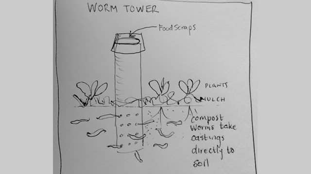 The bonus of worm towers is that they don’t require turning, digging, or actually any need for handling the worms and castings. The worms process the scraps and take their casting directly to the roots of the plants. A worm tower is a simple way to improve fertility without double handling – the worms do the work where you need them to be.