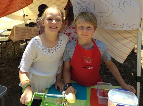 While Maia was busy hosting her great guinea-pig show at a recent Crystal Waters market, Hugh was at the ‘front-of-tent’ selling organic Curly Apples for a dollar with his school mate – ‘the springiest you will get’!