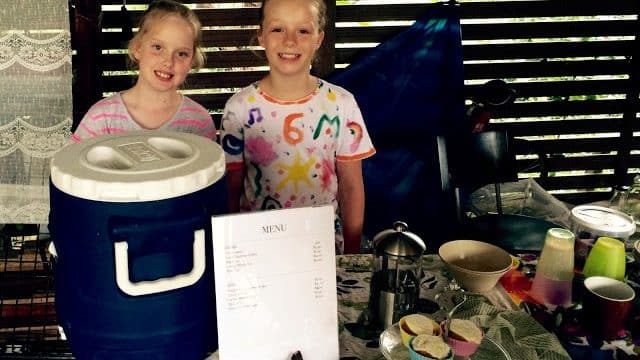 | Our Japanese WWOOFer (Willing Worker on Organic Farms) has been a great help to Maia setting up, and enjoyed some of the chocolate cake while Monty delighted in a babycino. Over lunch, Rin offered Maia and Hugh a Japanese lesson. Each day she is teaching them new phrases and words. WWOOFers are so fabulous. |